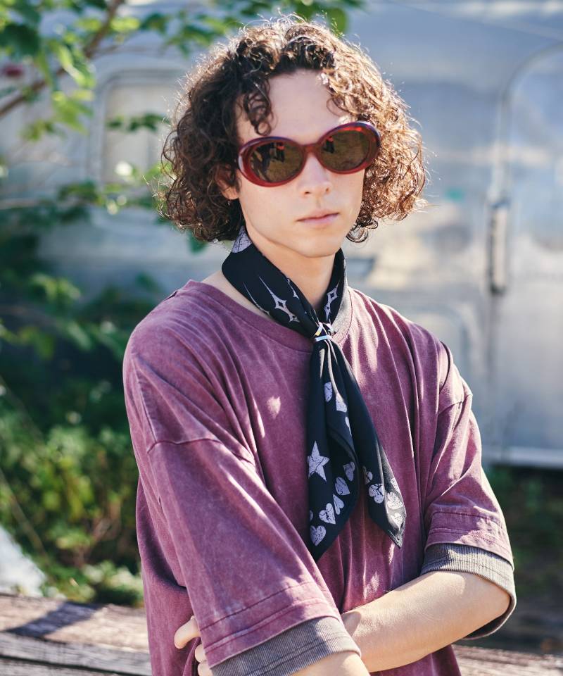 グランジ的なモチーフをスカーフに散りばめたSkull Heart Bandana。クラックの効果を持たせたハードな柄使いをプリントしながら、シンメトリックに配置することでモードストリートな一枚に。ロックテイストあるバンダナ使いの他、穴に通すだけでまとまるリングを付属しておりスカーフとして品良くまとめる着用もお楽しみいただけます。