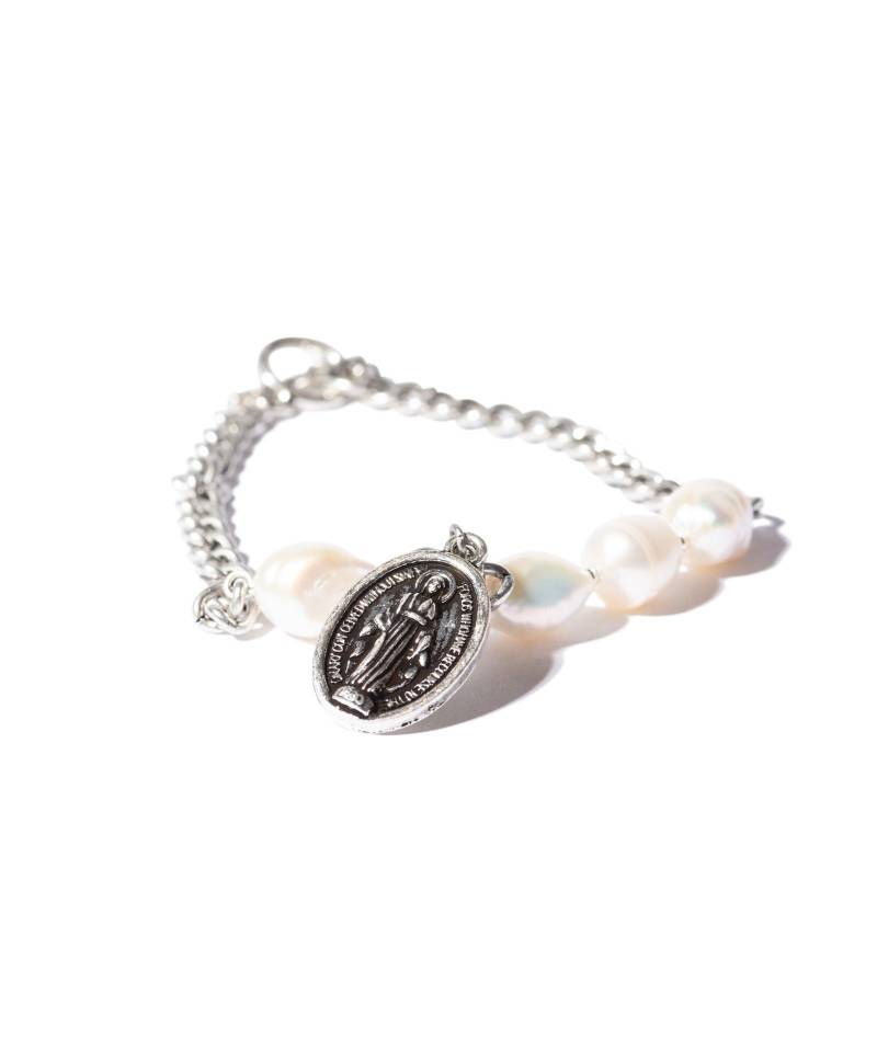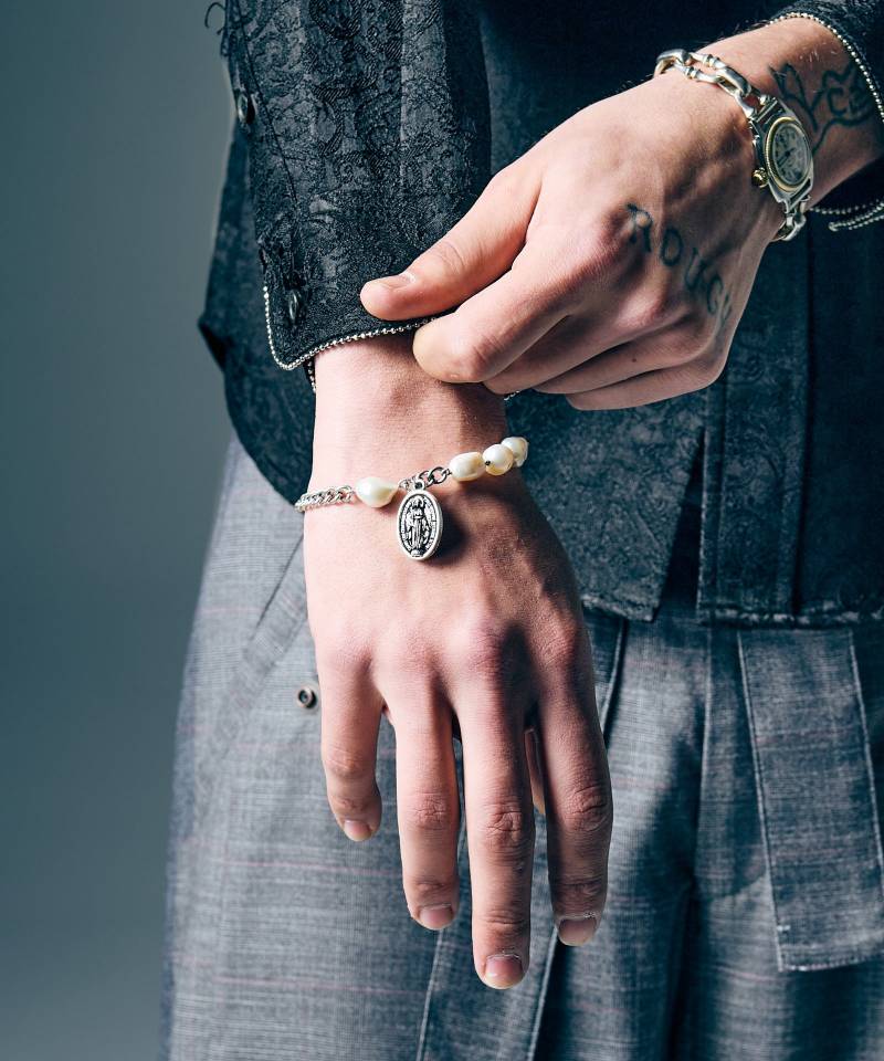 上品なチェーン使いにミステリアスなエッセンスを添えるMaria Pearl Bracelet。手元を彩るのは等級の高い淡水パールとチェーンとのエレガントなコントラスト。チャームとしてマリアコインのチャームを配して神秘的なムードを加えました。