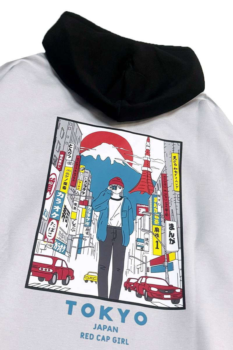 バックには東京の街並みをモチーフにしたポップなイラストと”TOKYO”のロゴをプリントし、遊び心のあるデザインに仕上げています。フロントはシンプルな無地仕様で、バランスの取りやすい一着です。