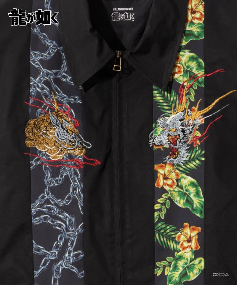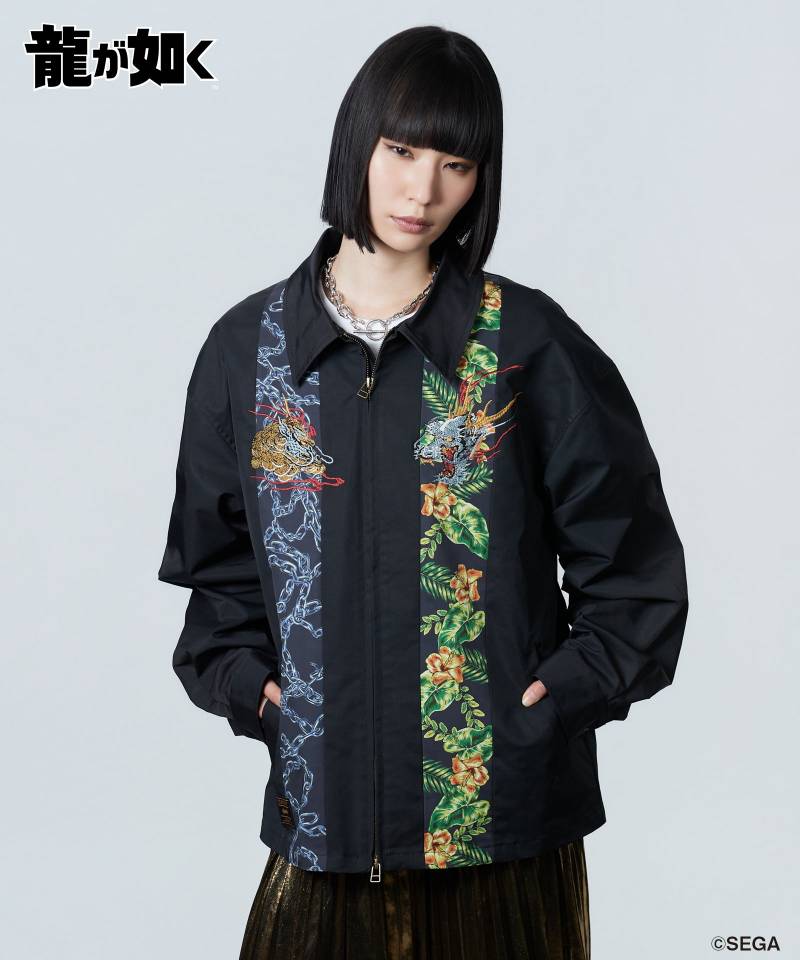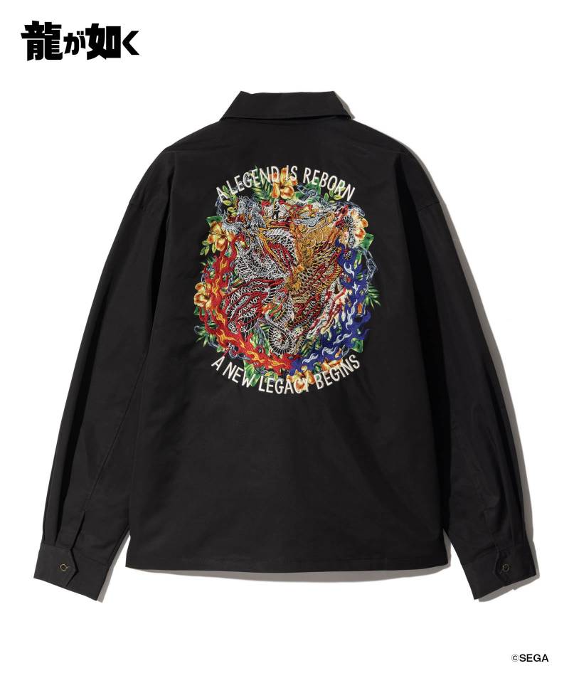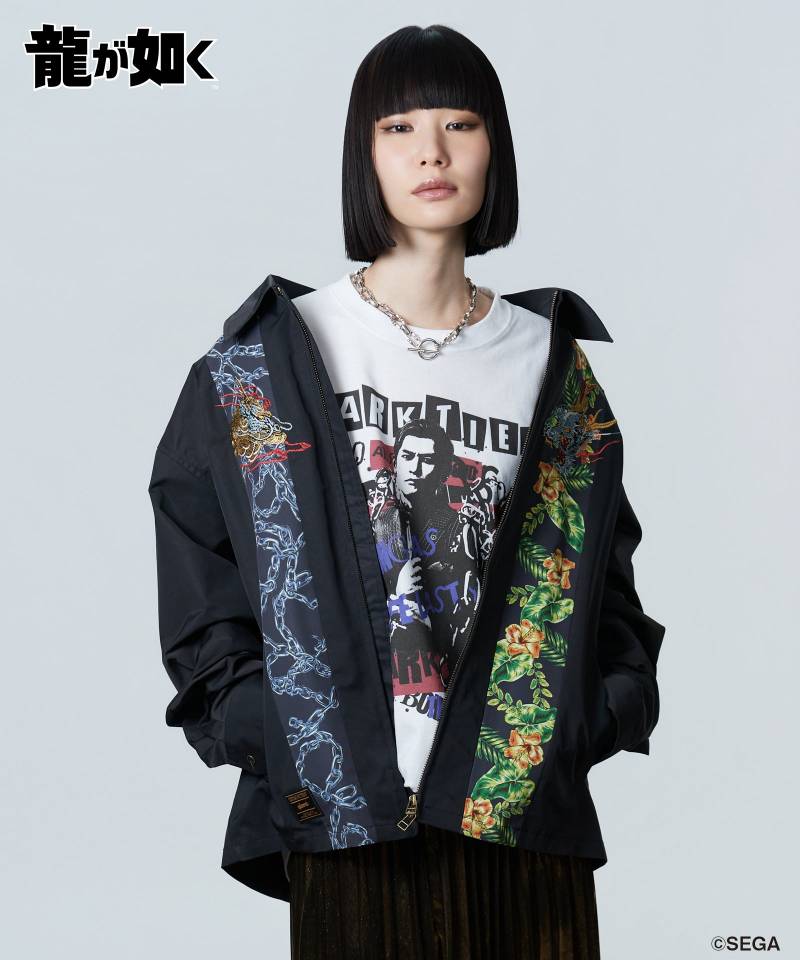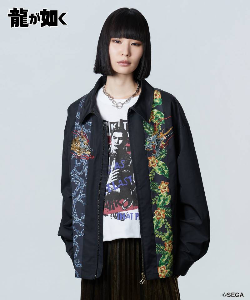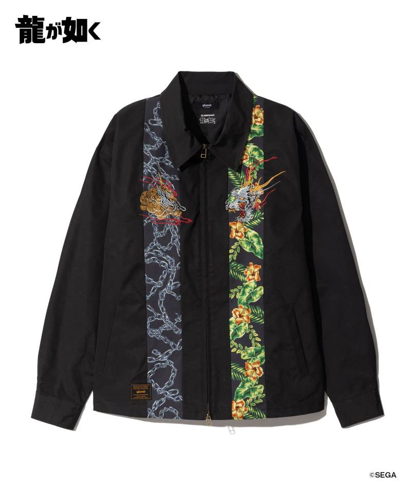 『龍が如く 極3 / 龍が如く3外伝 Dark Ties』とglambがコラボレーション。桐生 一馬と峯 義孝のバトルをスーベニアジャケットに仕立てたKiryu vs Mine Jacket。フロント胸元には2人の体に刻まれる応龍と麒麟の刺青をそれぞれ刺繍。キューバシャツを思わせるラインモチーフは左身頃には桐生が着用するかりゆしウェアの柄を、右身頃には峯が技を繰り出す際に現れる鎖のエフェクトをあしらっています。バックスタイルでは花と鎖の柄をプリントした上に応龍と麒麟の柄を大判で刺繍。さらには作品にまつわる言葉や2人のヒートも刺繍し、決戦の場面をドラマティックに演出しました。テキスタイルにはほのかな光沢あるコットンタッチの生地を使用。身幅を広く設けたビッグシルエットは着丈を短めに設定しており、ストリートの今を感じていただけます。