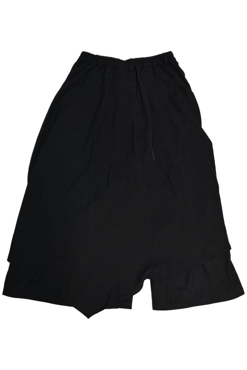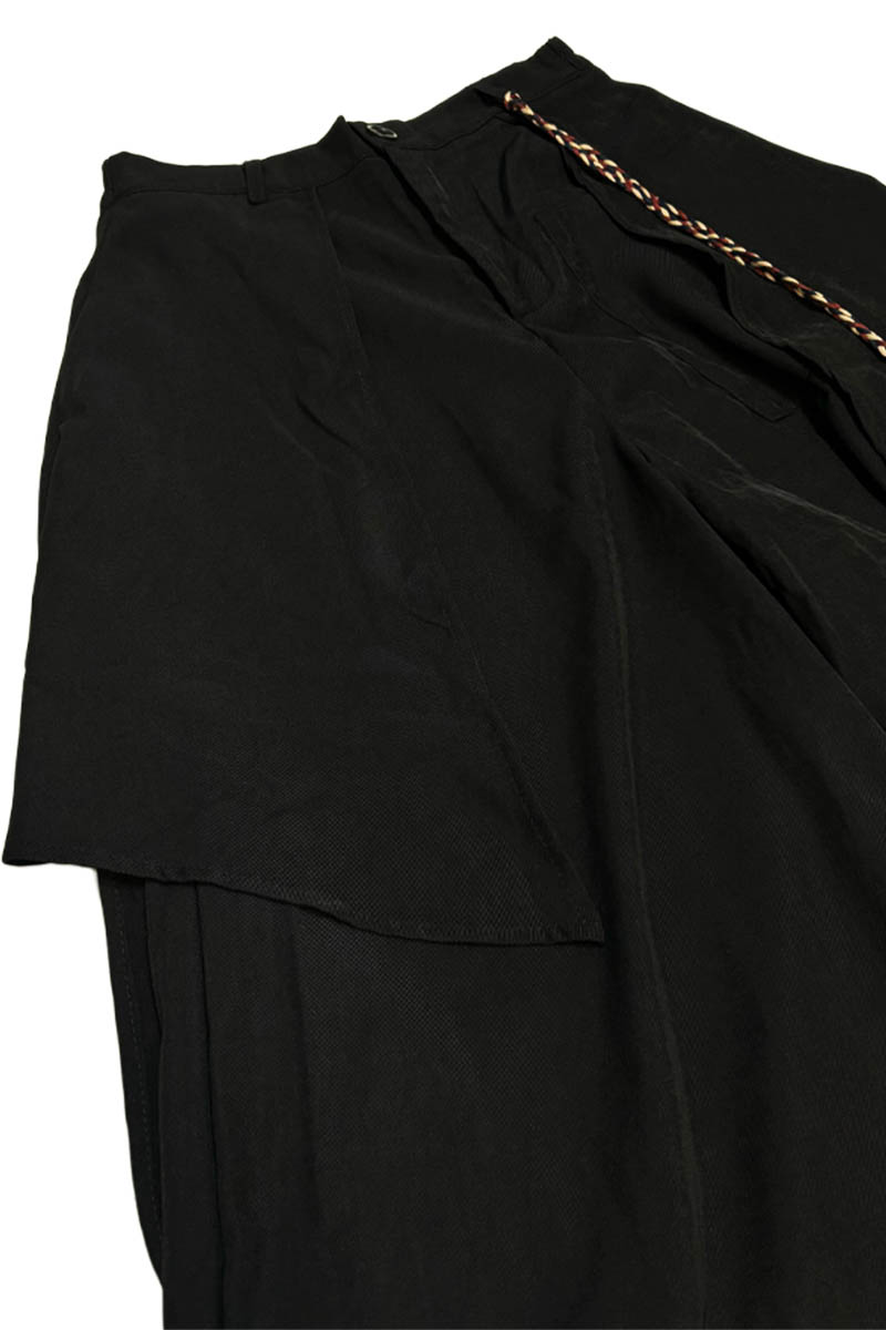 中ウエストの安定したフィッティングから、スカートのように広がる大胆なドレープ・シルエットを形成。歩行に合わせて揺れる立体的なラインがスタイルに動きを与え、印象的な佇まいを演出します。非対称に重ねられたレイヤード・デザインが奥行きを生み、近未来的なムードと個性を際立たせます。