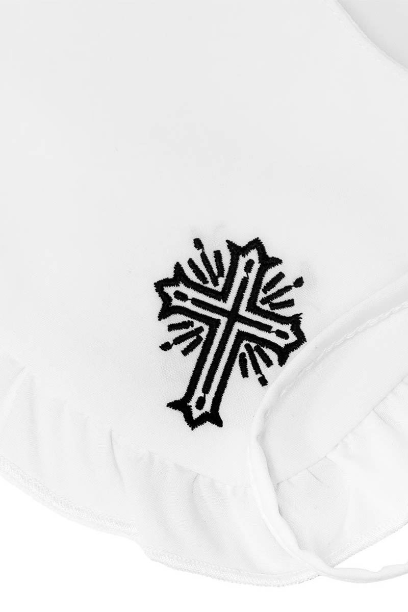 襟先に十字架の刺繍、たっぷりフリルの襟元をリボンで留めたガーリーで存在感たっぷりのゴシックつけ襟が登場!