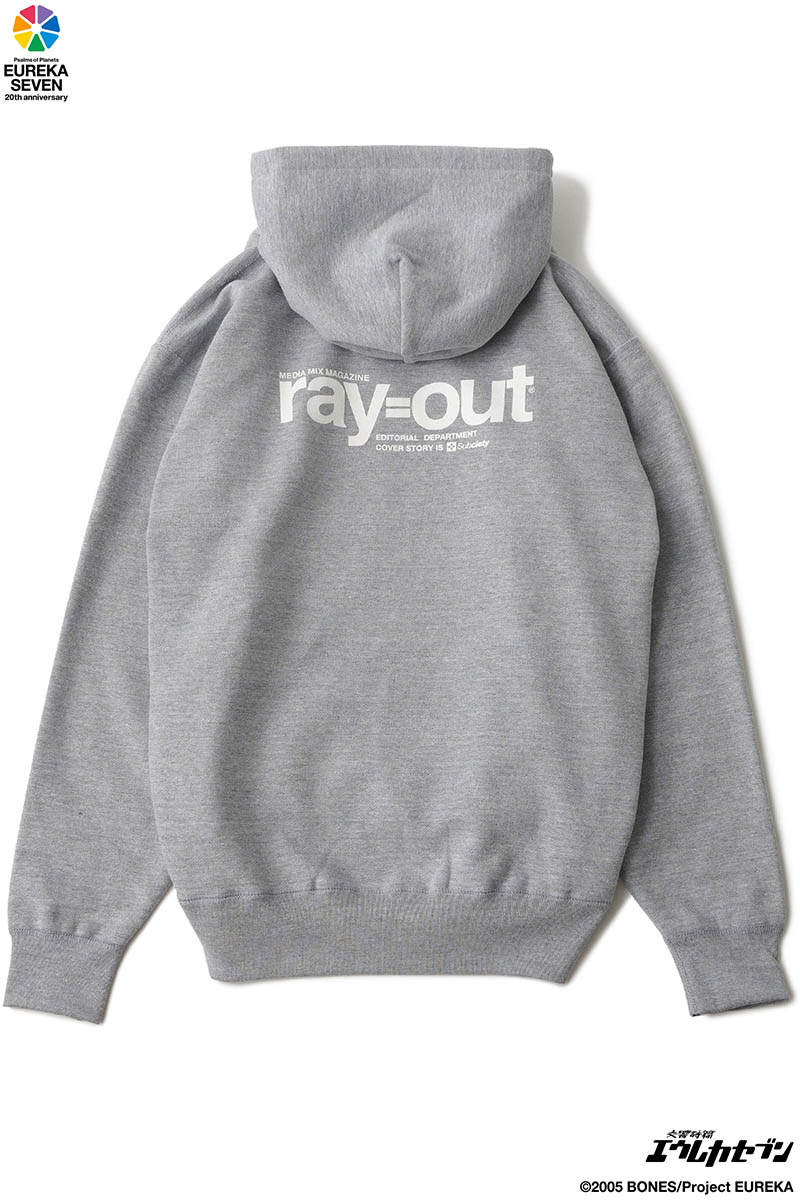 作中に登場する雑誌「ray=out」の編集部用のパーカをイメージ。左胸とバックにロゴをプリントで施しました。ブランドロゴもさりげなくオン。