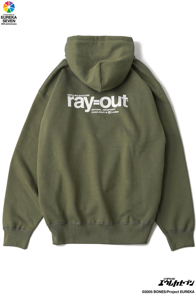 作中に登場する雑誌「ray=out」の編集部用のパーカをイメージ。左胸とバックにロゴをプリントで施しました。ブランドロゴもさりげなくオン。