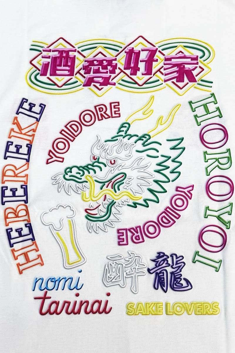 「酒愛好家」「HEBEREKE(へべれけ)」「HOROYOI(ほろよい)」といった、思わずニヤリとしてしまうワードを、龍のグラフィックと共に大胆にバック・プリントした一着です。