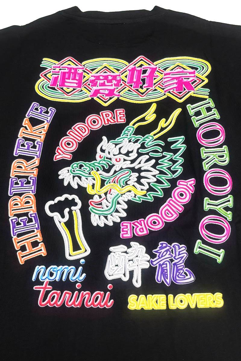 「酒愛好家」「HEBEREKE(へべれけ)」「HOROYOI(ほろよい)」といった、思わずニヤリとしてしまうワードを、龍のグラフィックと共に大胆にバック・プリントした一着です。