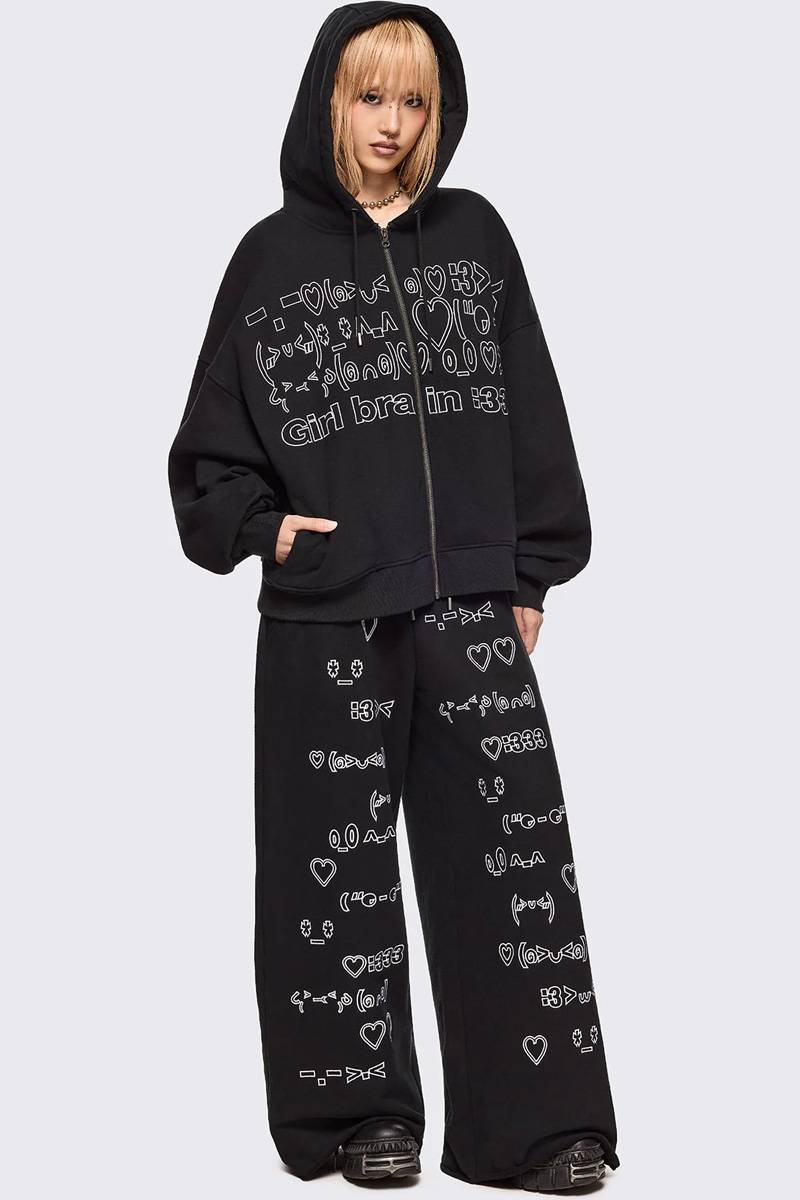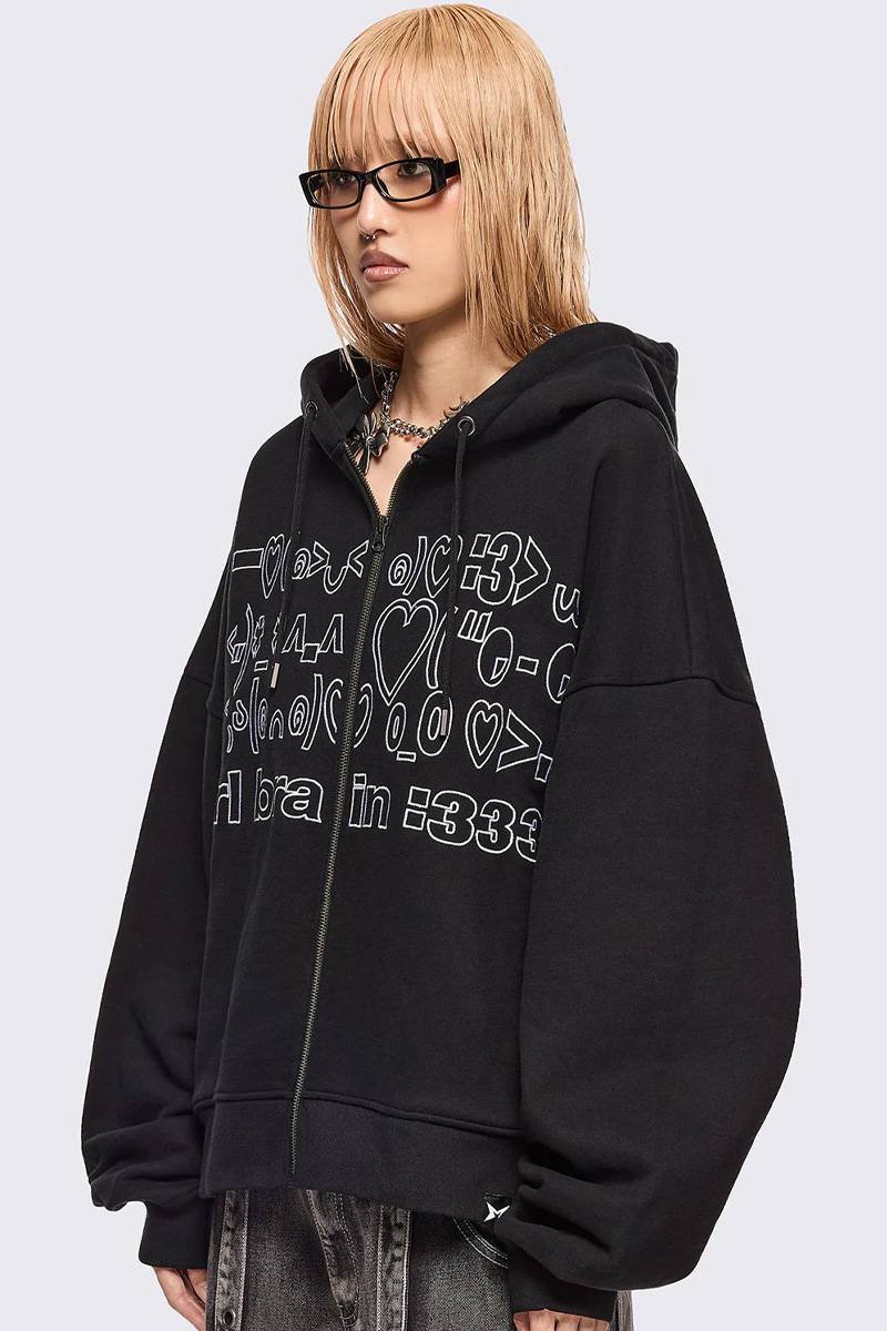2000年代の掲示板文化を象徴するアスキー・アートをモチーフにした刺繍が目を引くジップ・アップ・フーディー。
