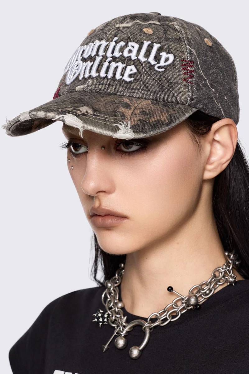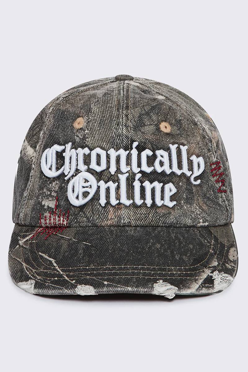フロントの“Chronically online”刺繍やダメージディテールがアクセントになり、スタイリングに程よい個性をプラスしてくれるアイテムです。カーブの効いたつばに加え、アイレット・ベンチレーションやバックル・ストラップを備えており、被りやすさと実用性も兼ね備えた仕上がり。