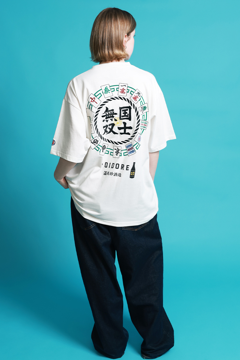 フロントには”無国双士”の力強いロゴをシンプルに配置し、バックには麻雀牌をモチーフにした円形デザインを大胆にプリント。日本酒・遊び・カルチャーを象徴するビジュアルが、個性を際立たせます。
