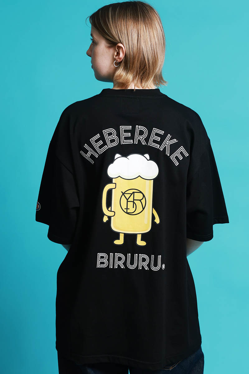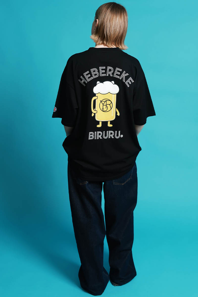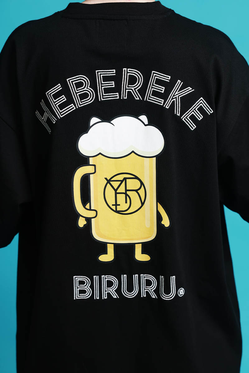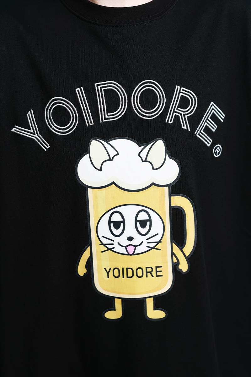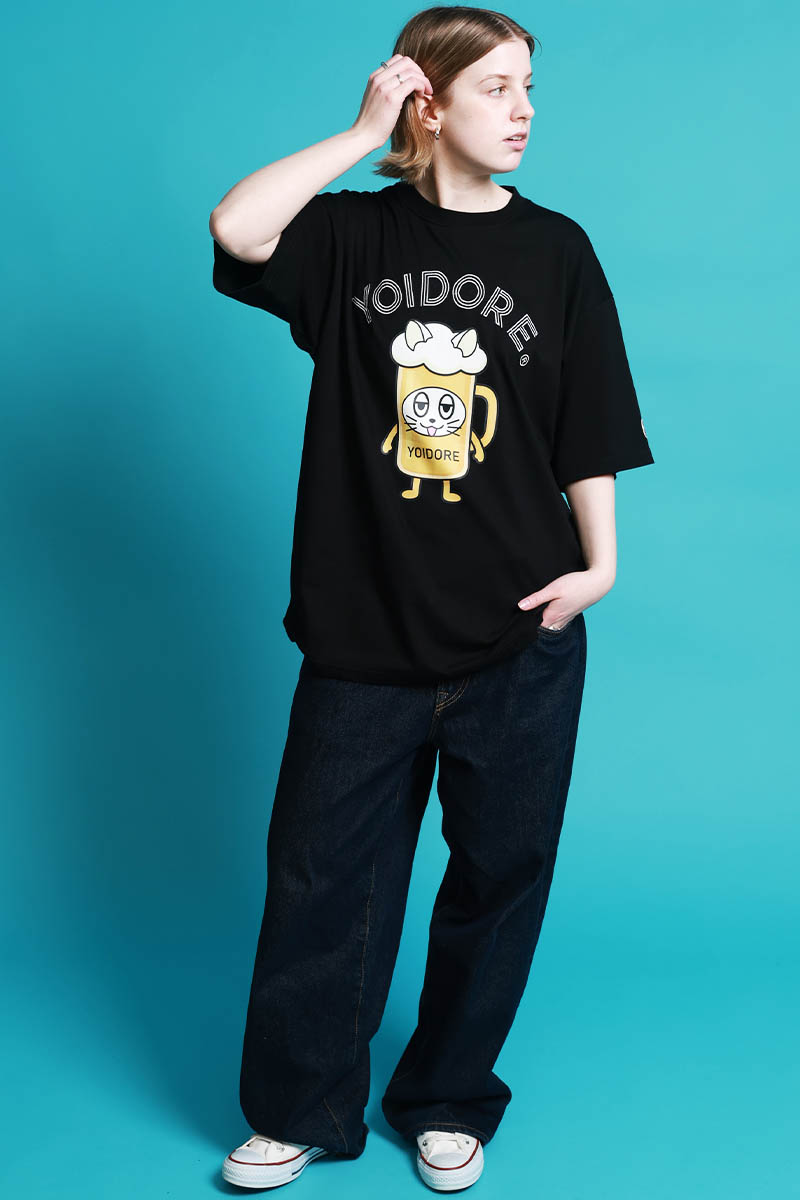 陽気なビール・ジョッキのキャラクターと"YOIDORE(酔いどれ)""HEBEREKE(へべれけ)"のロゴが、カジュアルなコーディネートにアクセントを加えます。