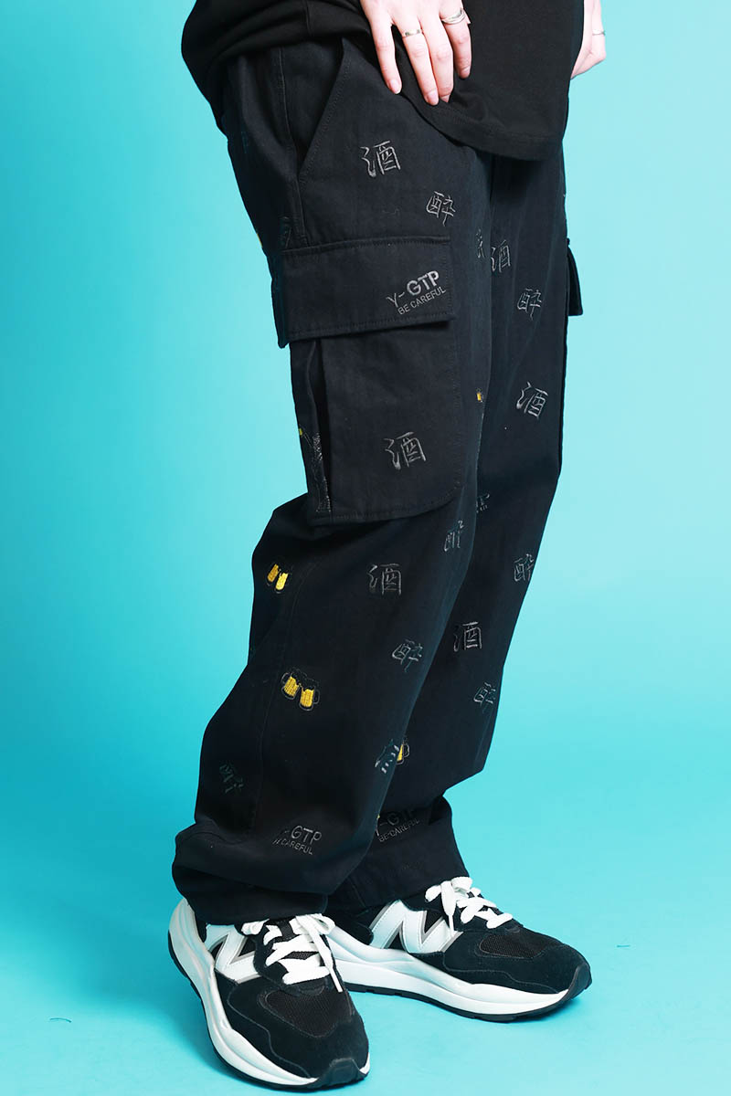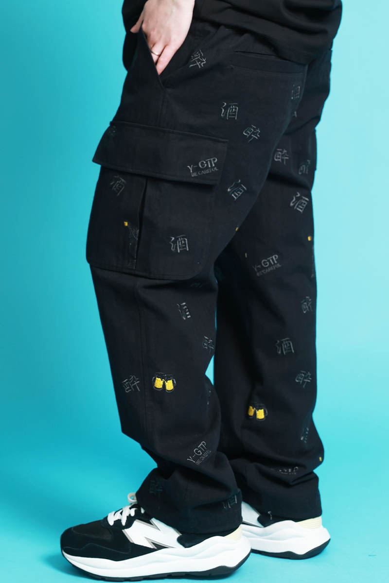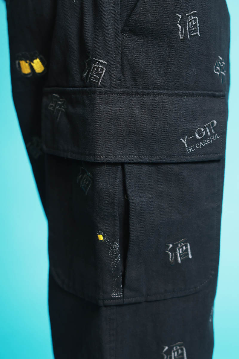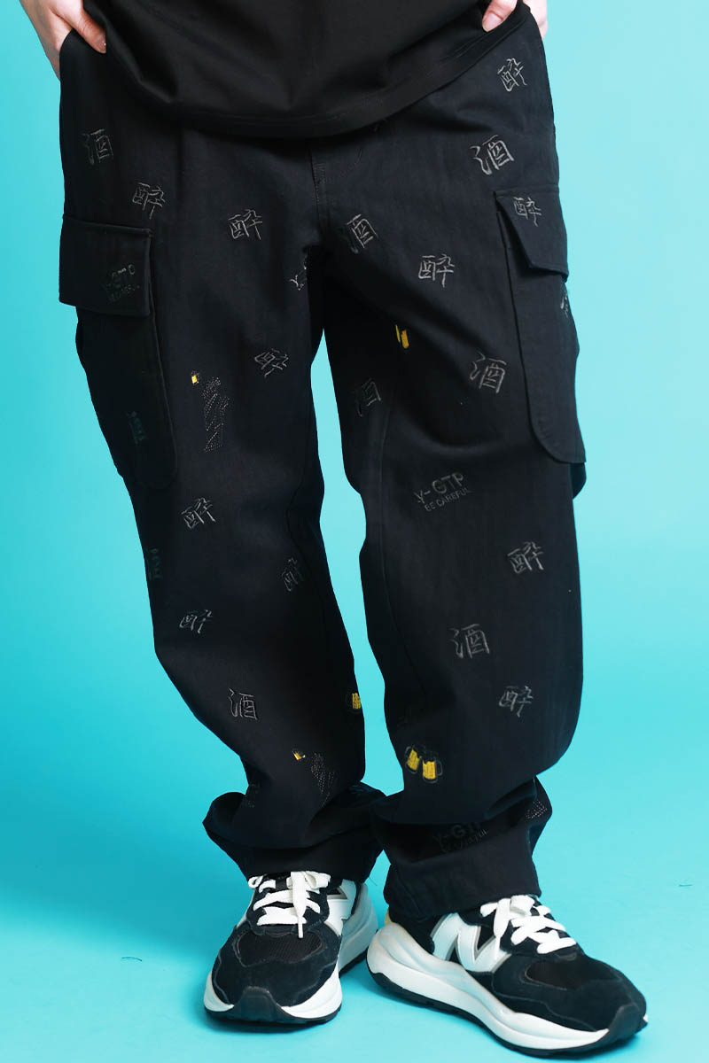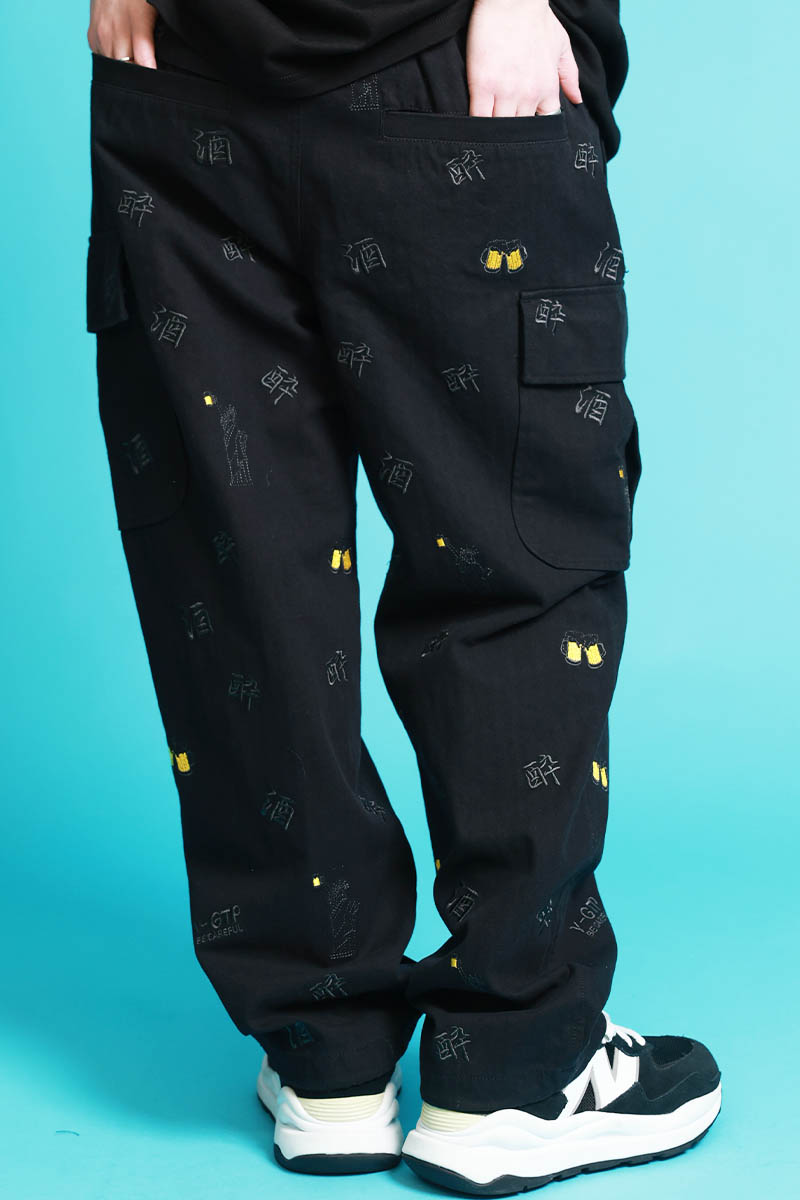 YOIDORE(ヨイドレ) 酒刺繍総柄カーゴ・パンツ - Black