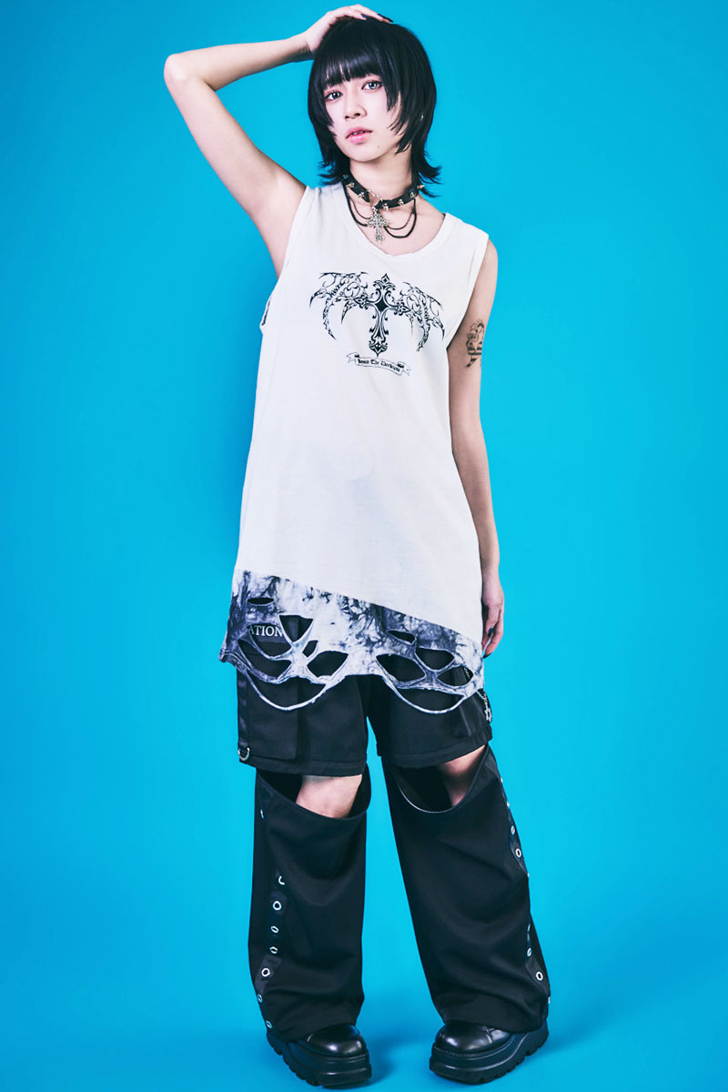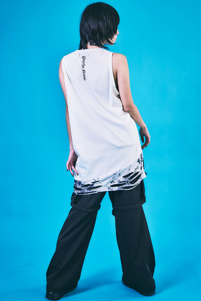 大胆なグラフィックとクラッシュ・デザインが目を引くロング・タンク・トップ。