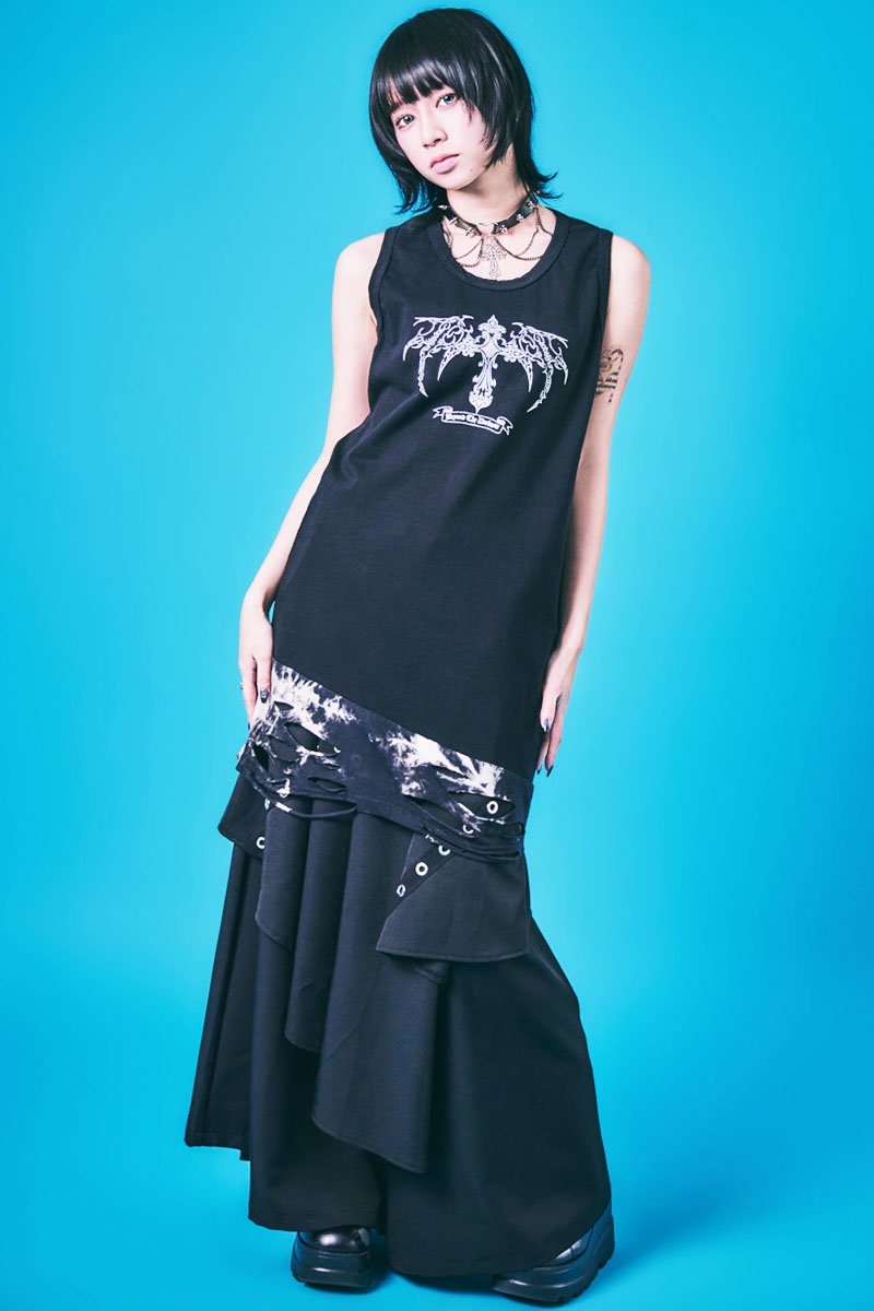 大胆なグラフィックとクラッシュ・デザインが目を引くロング・タンク・トップ。