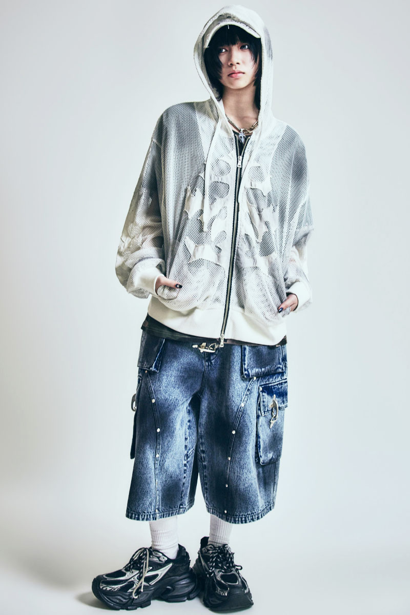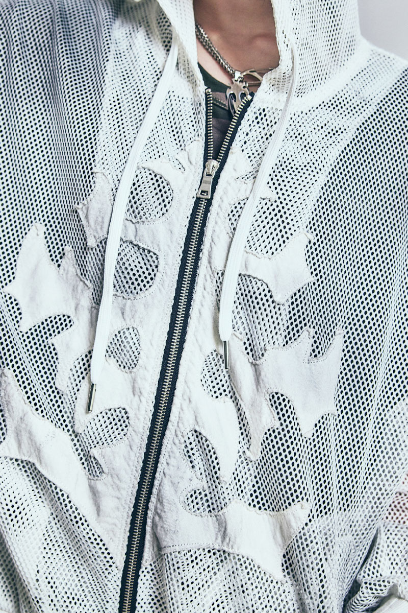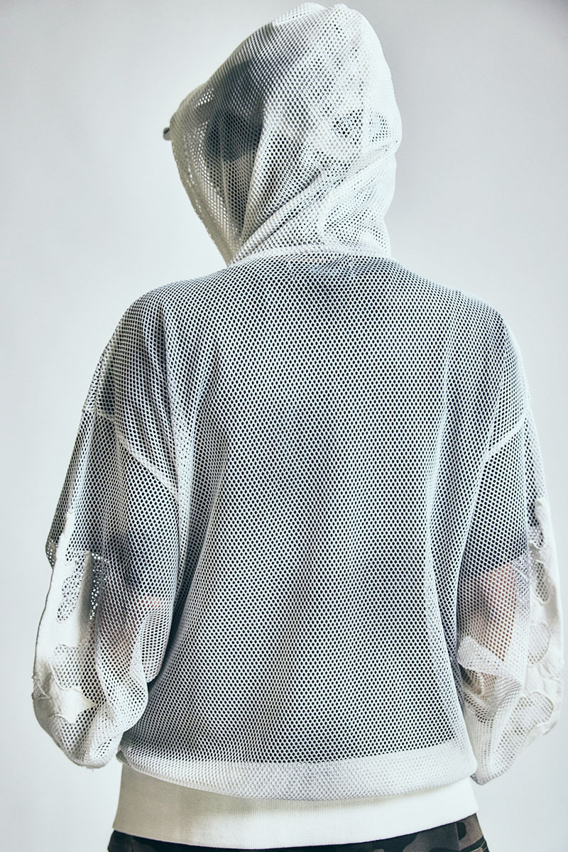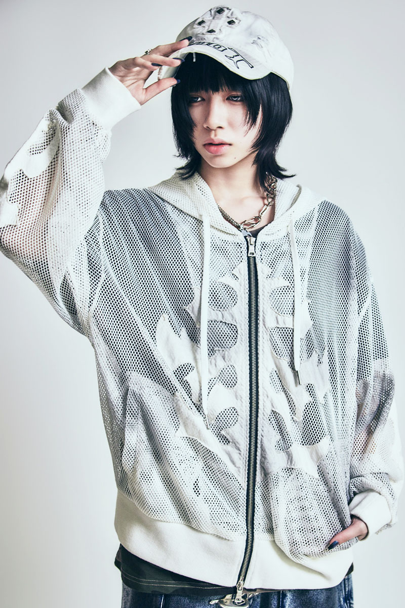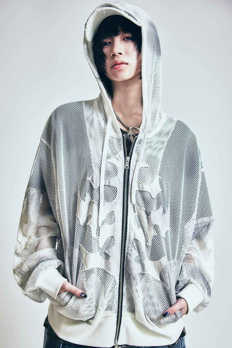 透け感のあるメッシュ素材が特徴のZIPパーカー。
