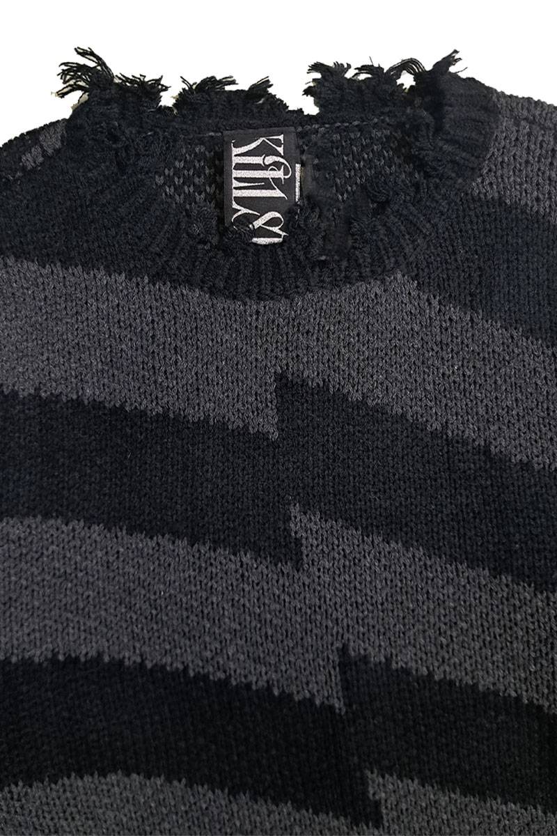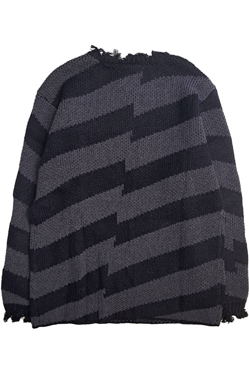 ブラックとチャコールのボーダーをベースに、中央でラインがズレたような変則的なジャガード編みを採用。さらに首元や袖口にダメージ加工を施した、退廃的な美しさが漂う一着です。
