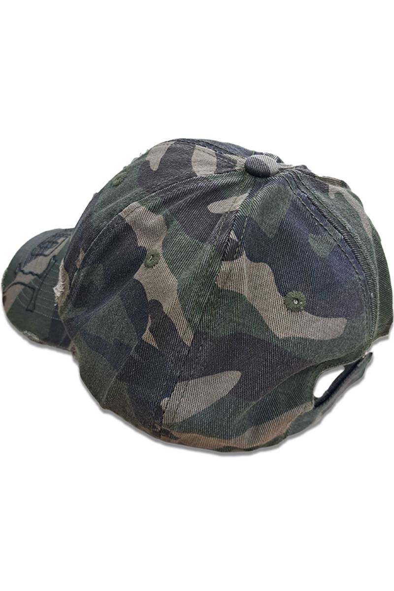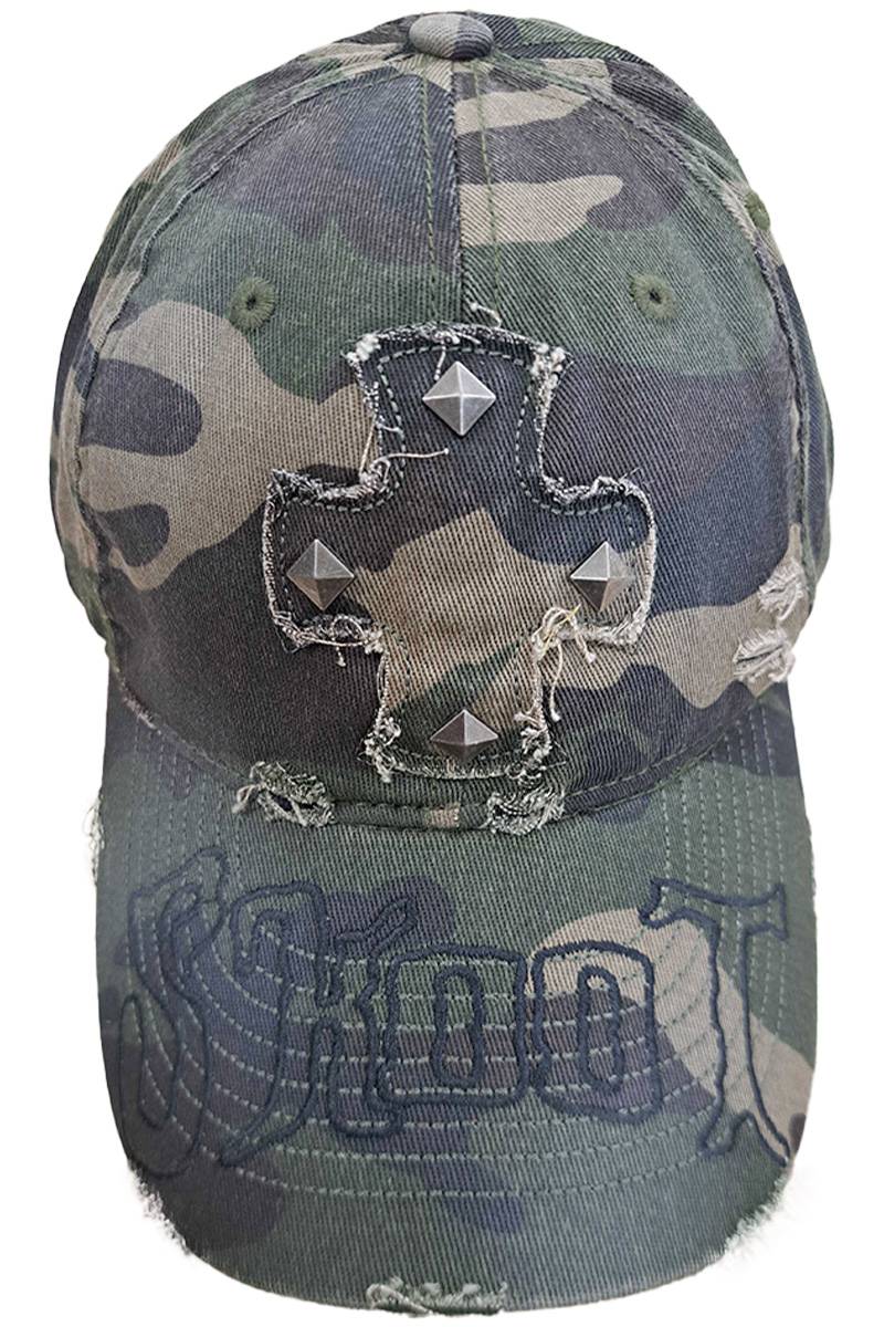 ミリタリーの定番であるカモフラージュ柄に、ハードなダメージ加工とメタル・スタッズを融合させた、存在感抜群のキャップが登場!