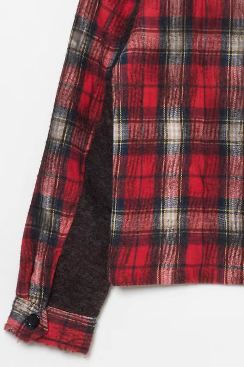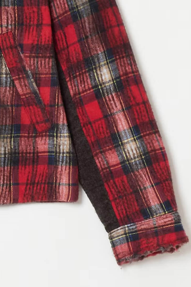 クラシックなチェック柄をベースに、異素材を組み合わせて再構築したシャツジャケット。