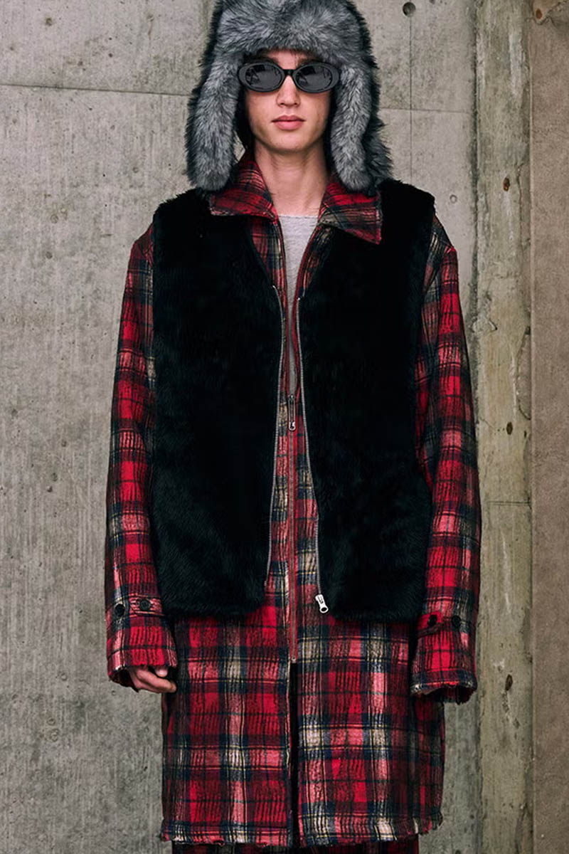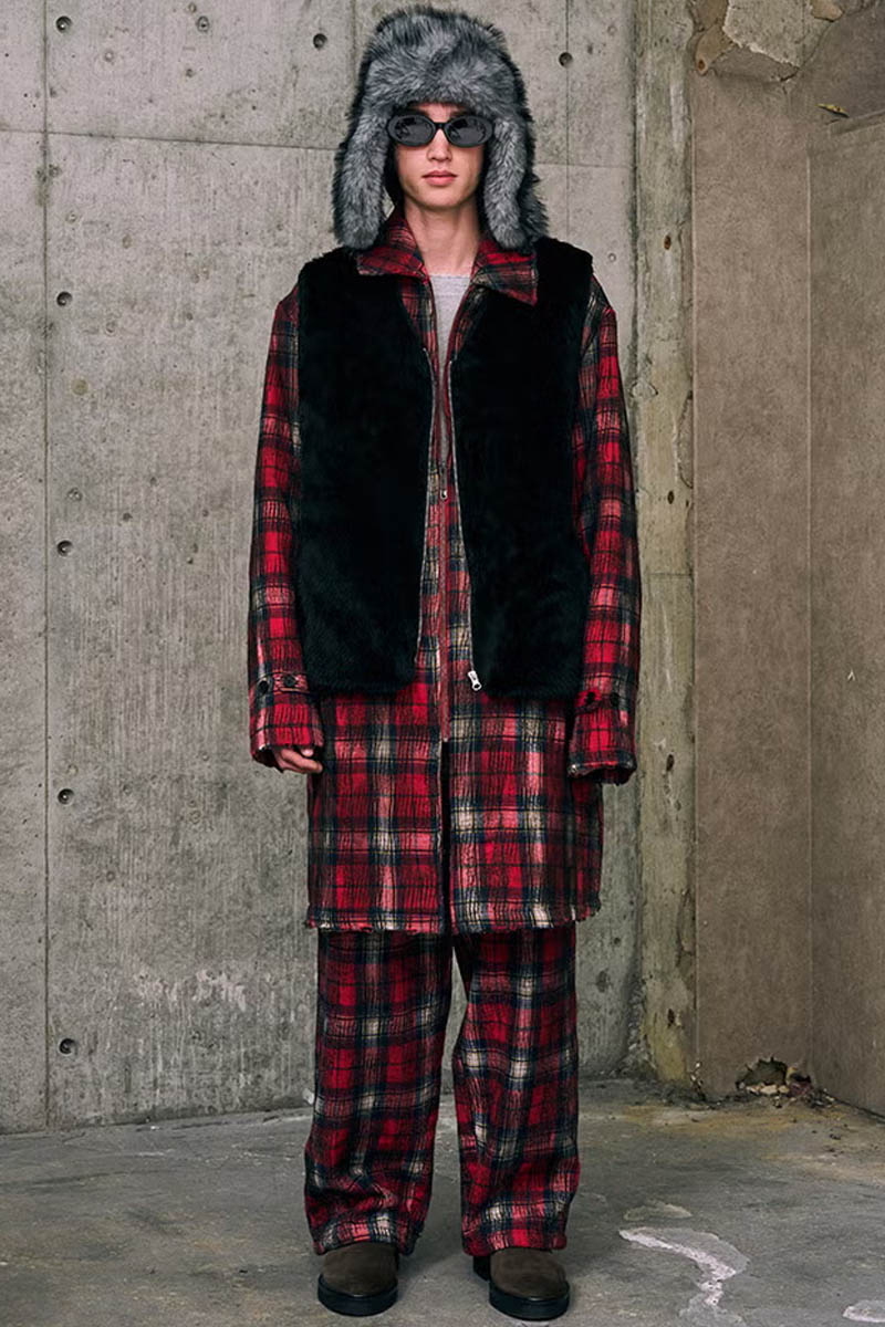 クリーンなチェックパターンに対し、柔らかく毛足のある素材を組み合わせることで、違和感のあるバランスを構築。