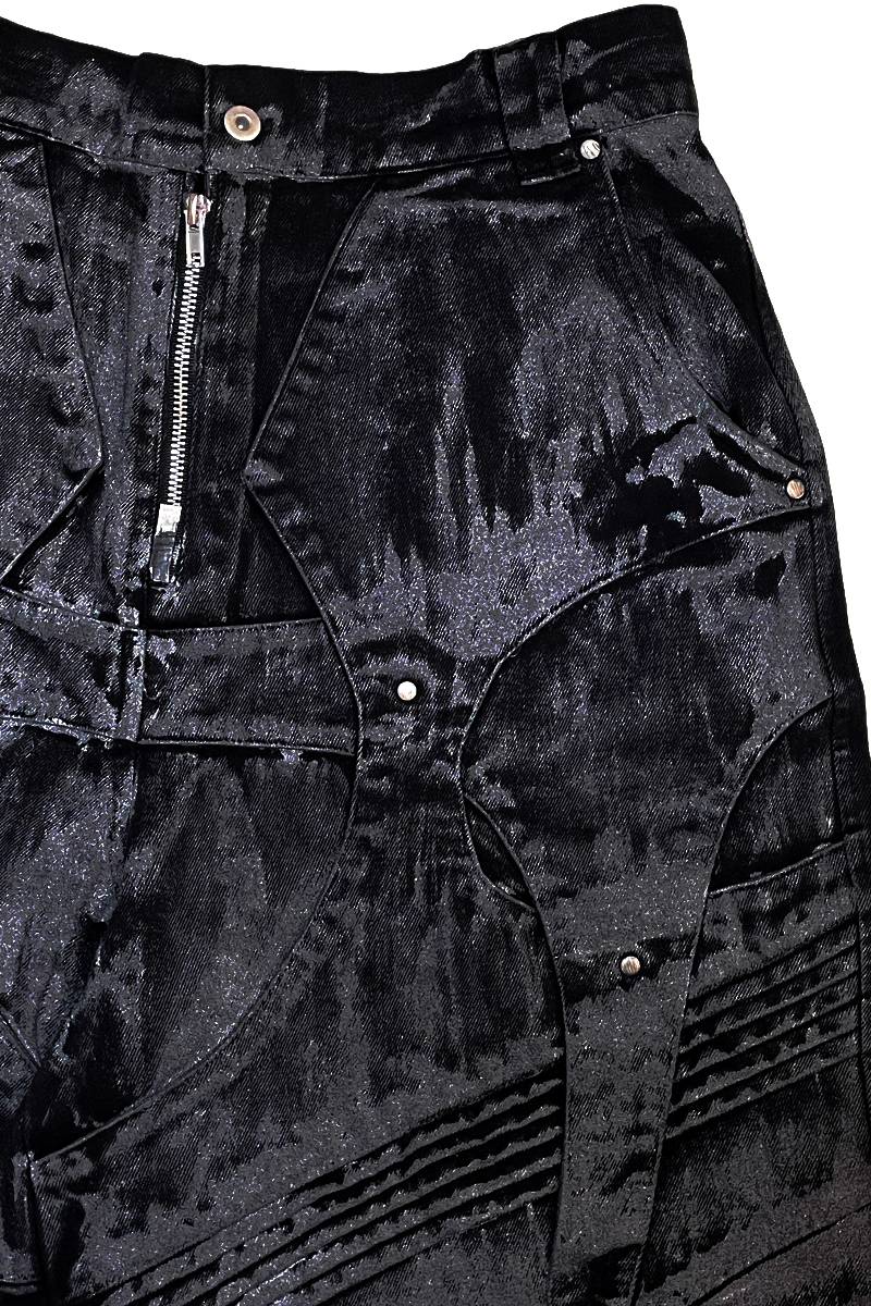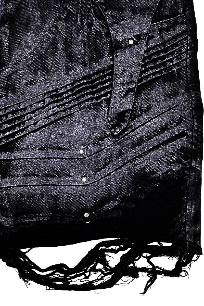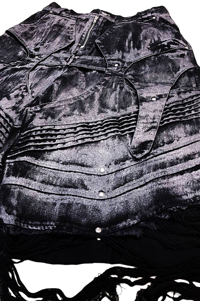 裾は断ち切り仕様にすることで、ラフで退廃的なムードを演出。さらに垂れたフリンジ・ディテールが動きのある表情を加え、ストリート、モード、サイバーパンクなスタイリングとも好相性。